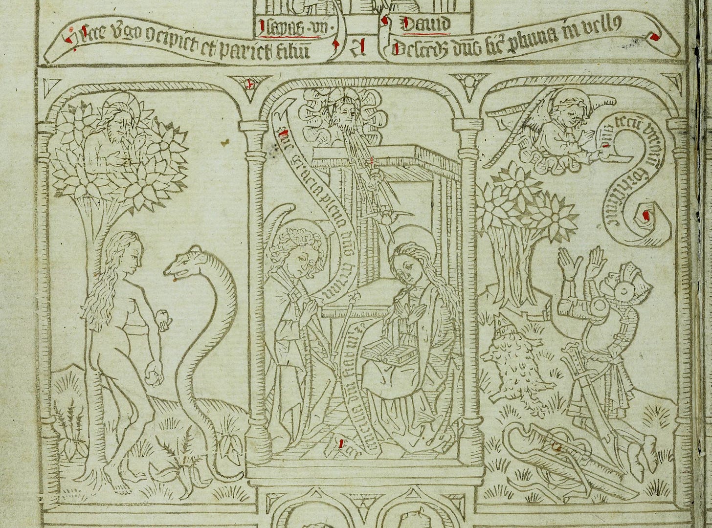 Gideon’s fleece is a sign of the promise of salvation, and is explicitly linked, in places like the Biblia Pauperum, to Our Lady, specifically the prophecy of Isaiah 7:14: “Therefore the Lord himself shall give you a sign. Behold a virgin shall conceive, and bear a son, and his name shall be called Emmanuel.”